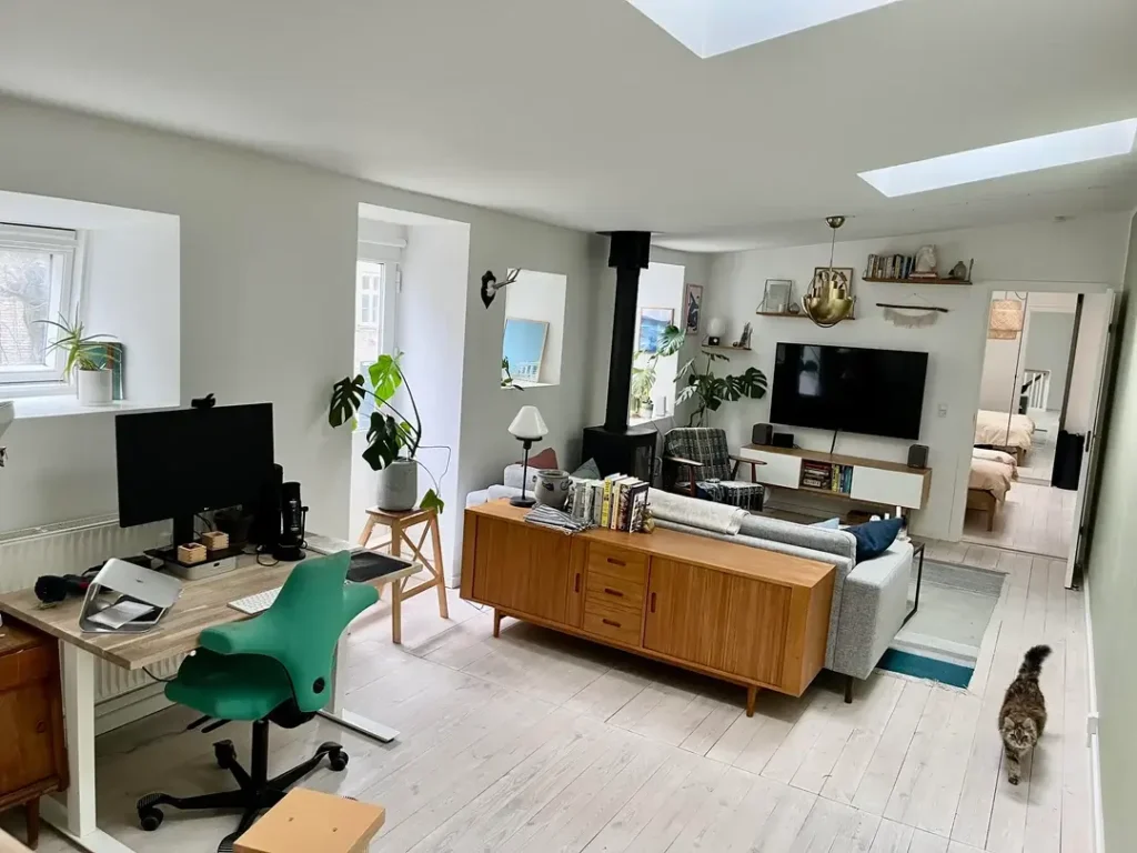Plants throughout the space, including large floor plants near the wood stove, bring nature inside and improve the environment for both working and relaxing. The white painted floorboards and skylight add to the bright, airy Scandinavian-influenced aesthetic.