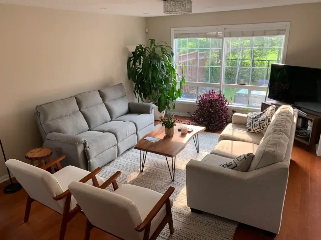 What r/neilxm demonstrates here is how cream and gray seating creates a foundation that works with multiple accent colors. The large window floods this room with natural light, and the neutral palette reflects that brightness instead of absorbing it. The mid-century accent chairs add warmth through their wooden frames without competing with the overall calm aesthetic.