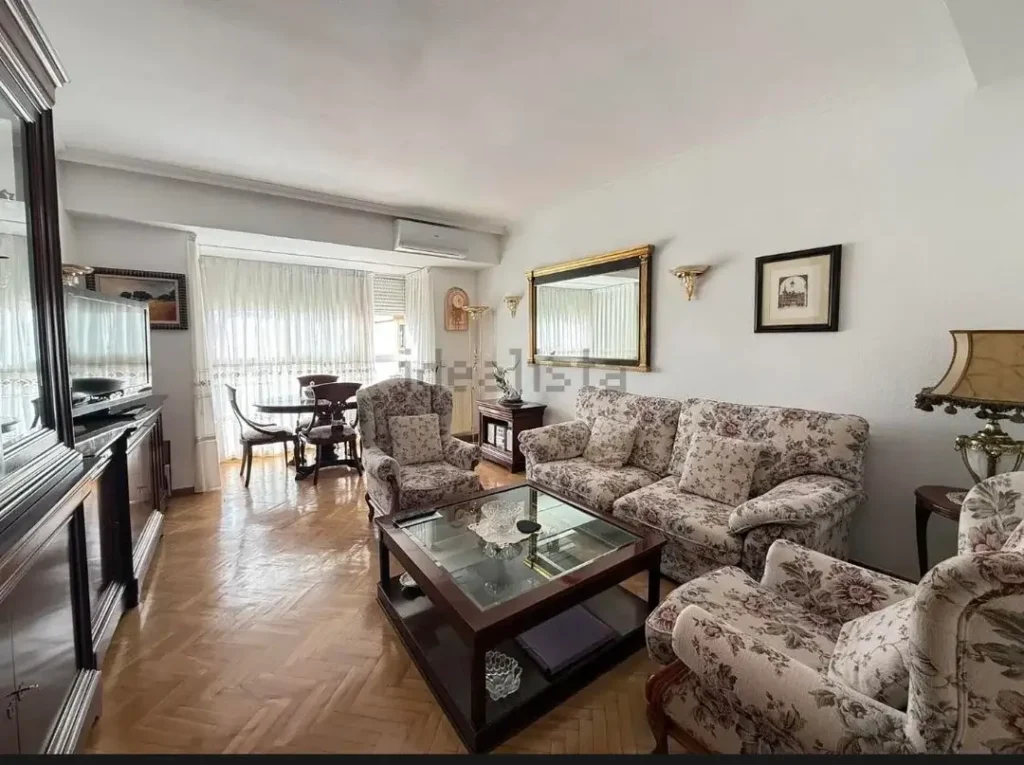 r/itsric0001 chose floral-patterned upholstery for the sofa and chairs, which reads as traditional but gains freshness from the open, airy layout and abundant natural light. The glass-top coffee table with exposed shelving underneath keeps the center of the room transparent, preventing the patterned furniture from overwhelming the sight lines. Parquet flooring adds another layer of traditional detail that harmonizes with the furniture style.