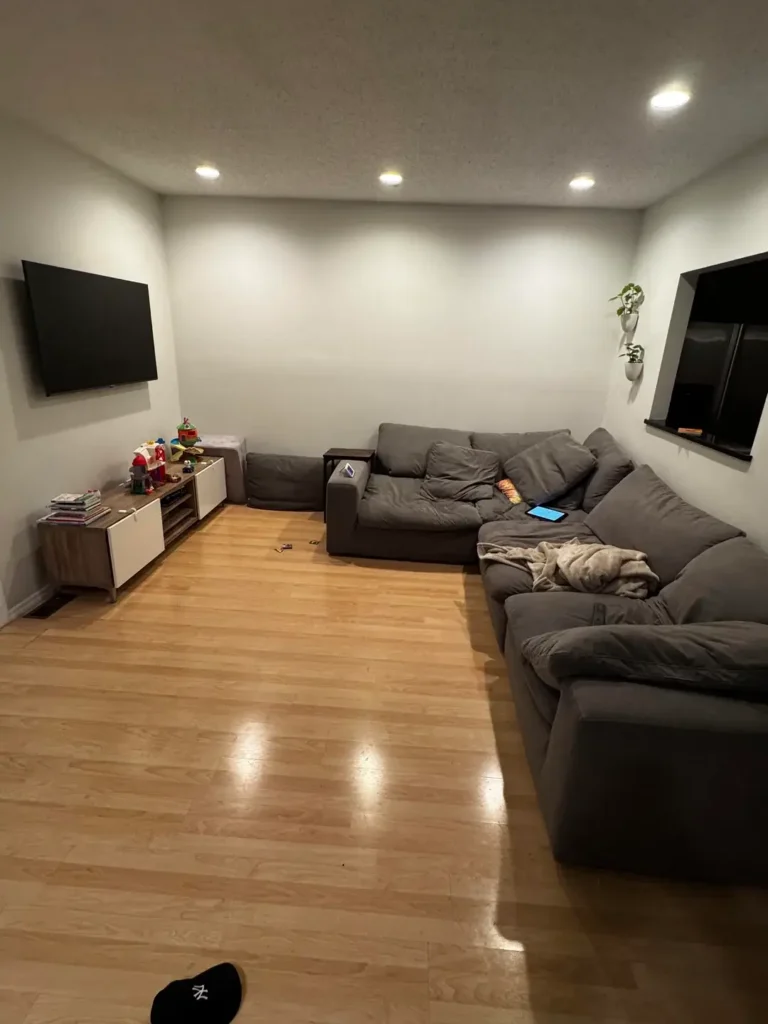 r/RU23NJ kept this basement space deliberately minimal with just a large sectional, wall-mounted TV, and low media console. The light wood flooring prevents the room from feeling like a dark cave despite the lack of windows. Recessed lighting provides ambient illumination that works for movie watching without creating glare on the screen.