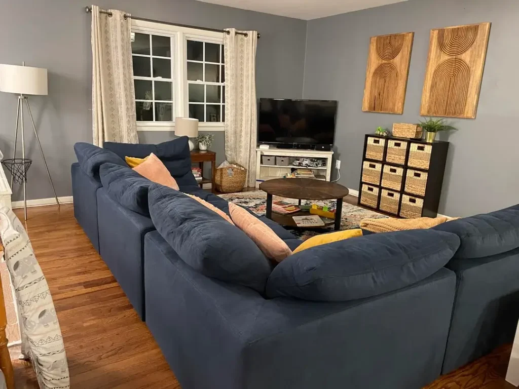 The cube organizer with wicker baskets serves double duty in this room that r/lenorebeads13 designed with a navy sectional. The baskets hide clutter while adding organic texture that contrasts beautifully with the smooth painted walls and upholstered furniture. The navy sofa against gray walls creates a sophisticated color combination that feels mature without being boring.
