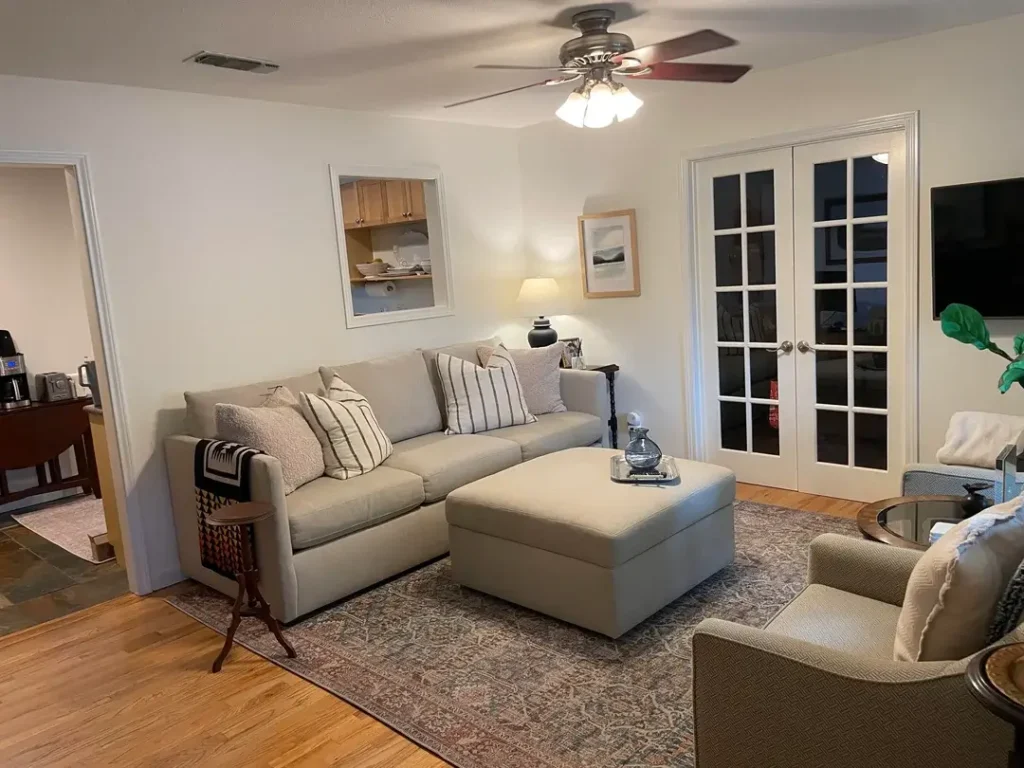 r/stephaniemm1 selected a loveseat with an ottoman instead of a full-size sofa, which provides seating for three while keeping the room feeling open. The beige and geometric pillows add pattern without making bold color commitments. French doors to the adjacent room create an open feel that makes the small space work harder.