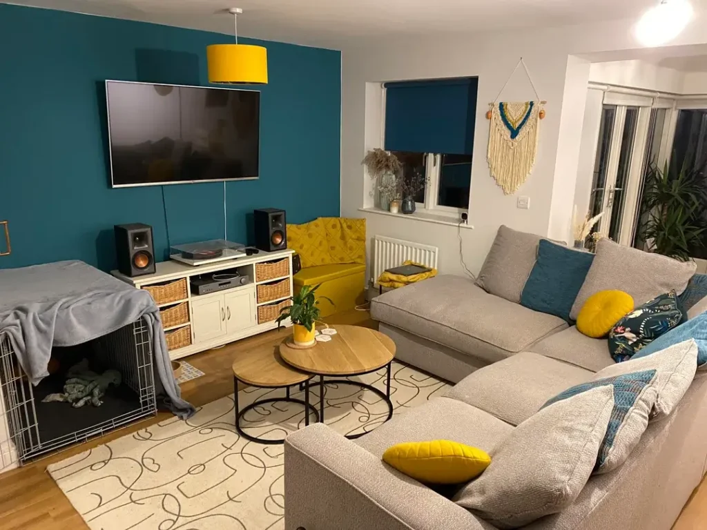 The teal accent wall behind the TV immediately draws attention, but r/DesignMyRoom makes it work by repeating that exact color in the throw pillows and the yellow accent chair tucked into the corner. The gray sectional provides a neutral anchor that lets the bold colors shine without competing. Even the yellow pendant light above the white media console ties back to the chair, creating a color triangle that guides your eye around the space.