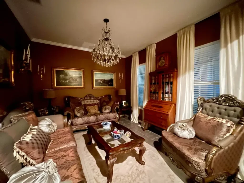 The deep burgundy walls in this room create an intimate, cocoon-like atmosphere that r/Professional_Box5207 enhances with gold-framed artwork and a crystal chandelier. The floral upholstered furniture with tufted details and ornate wooden frames commits fully to a Victorian aesthetic rather than trying to modernize it. Even the china cabinet becomes part of the overall design story.