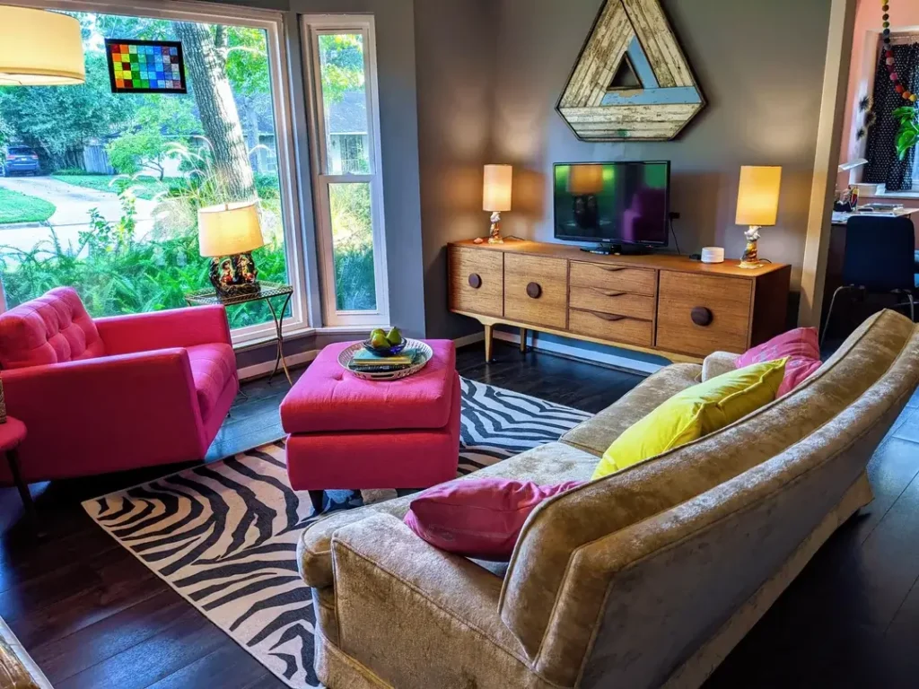 r/friedtechamy layered a zebra print rug under mid-century furniture and paired it with solid fuchsia ottomans and chairs. The geometric triangle wall art picks up colors from throughout the room without competing with the floor pattern. Dark charcoal walls provide a dramatic backdrop that makes the bright colors pop even harder.