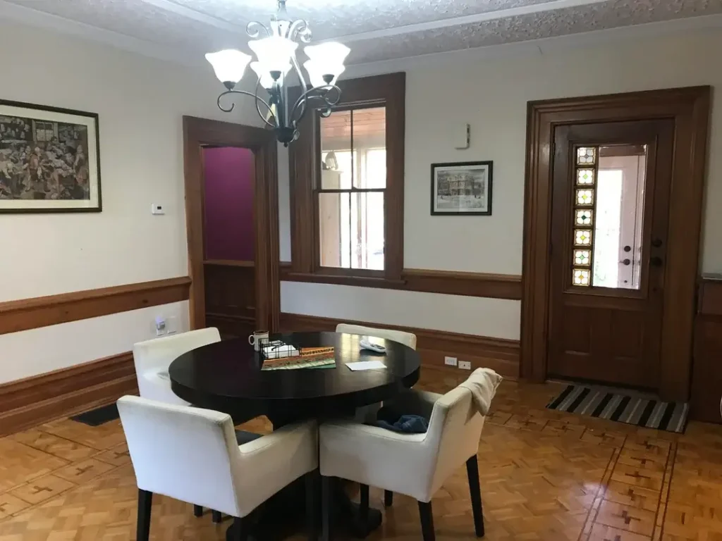 By choosing simple furniture dark round table, white slipcovered chairs the original woodwork and floor pattern become the focal points they were always meant to be.
