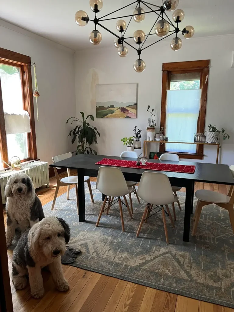 Two large fluffy dogs posed at the front of the photo are an undeniable improvement to the room’s appeal, though they’re harder to source than the chandelier.