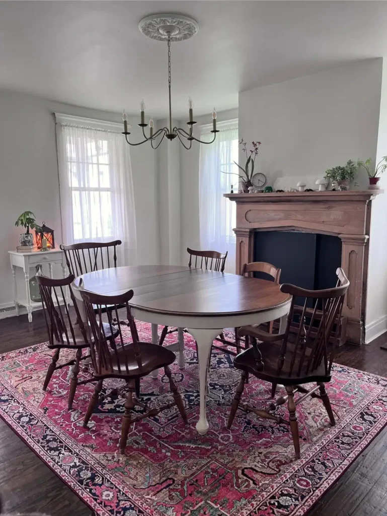 r/ellaunderfoot shares a north-facing dining room anchored by a large Persian rug in deep crimson, navy, and dusty rose and it completely transforms what would otherwise be a very quiet space.