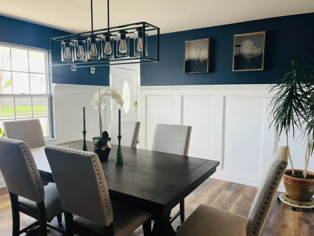 r/HomeDecorating painted the upper walls in deep navy and installed crisp white wainscoting panels below the chair rail, creating a two-tone wall treatment that feels both traditional and contemporary.