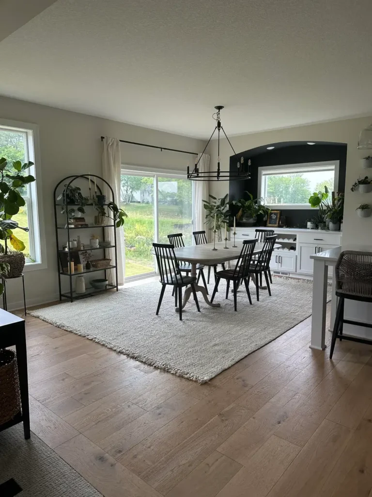 The jute rug is worth noting specifically. It’s one of the most versatile choices for modern farmhouse dining rooms because it adds texture without color, which means it works with almost any palette.