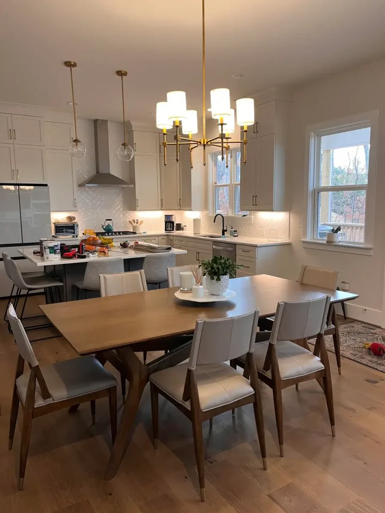 The chandelier is the defining decision in this room. It’s substantial enough to mark the dining area as intentional, and the brass finish bridges the warmth of the wood table with the cooler tones of the white kitchen.