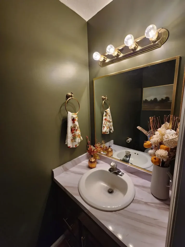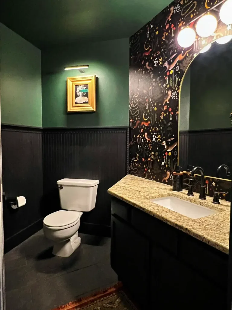 Dark doesn’t always mean black. This powder room takes a softer approach with deep sage green walls that feel both moody and calming at the same time.