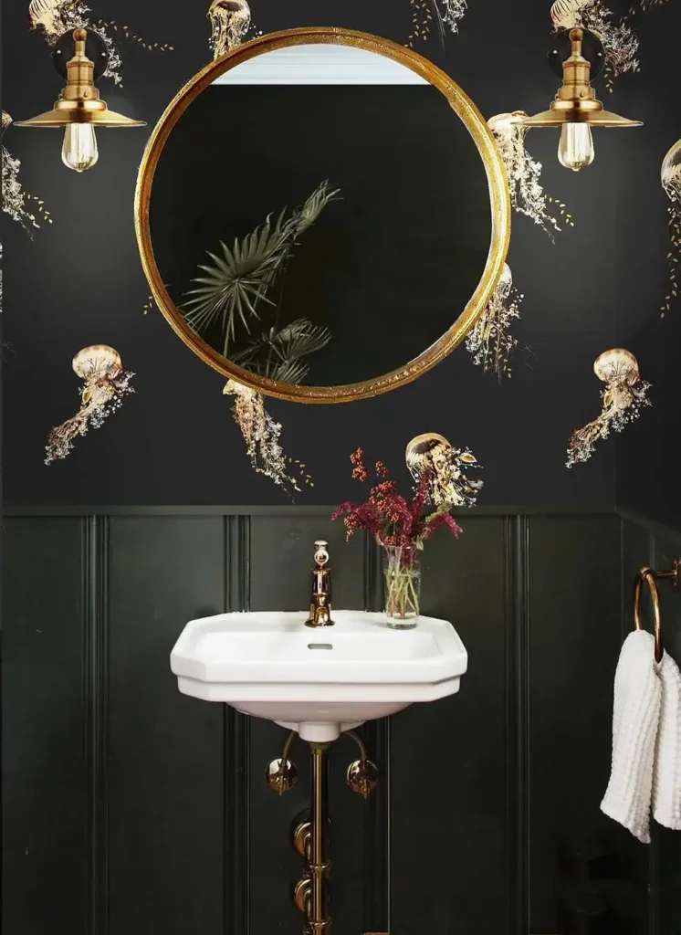 Gold fixtures tie directly into the gold elements in the wallpaper. This kind of coordination feels intentional rather than matchy-matchy because the tones vary slightly.