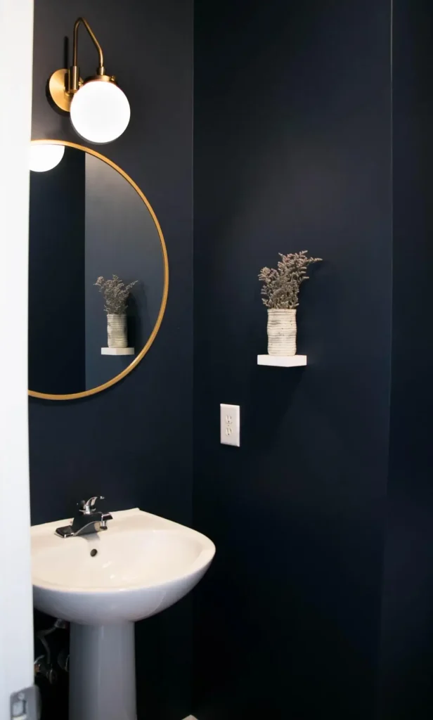 What r/Suspicious_Culture64 nailed is the power of restraint. Dark navy walls, one brass circular mirror, two simple wall sconces, and a single floating shelf with one small plant. The white pedestal sink provides necessary contrast without adding visual clutter.