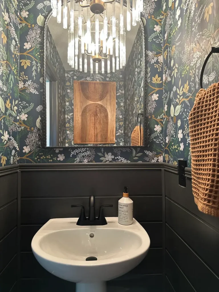 Deep emerald green creates richness without the starkness of black. This powder room uses dark green on the lower walls and complements it with a botanical print wallpaper featuring delicate white and gold flowers.