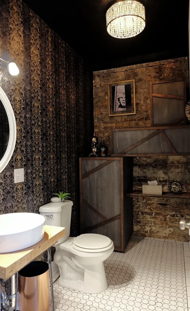 Not every moody powder room needs to feel refined and elegant—some should feel edgy and unexpected. This space combines exposed brick, skull-patterned damask wallpaper, and a black ceiling for maximum drama.