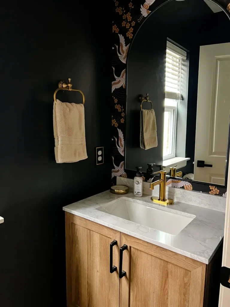Sometimes one accent wall makes a bigger statement than covering everything. This powder room uses black paint on most surfaces, then introduces a metallic wallpaper featuring white cranes and gold florals on a single wall.