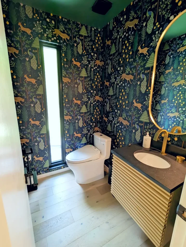 r/pinpointsnipe committed fully to the wallpaper concept by covering every wall and even the ceiling. The dark navy base keeps it moody while the rust-colored foxes and sage green trees add warmth and movement. That oversized round mirror with gold trim complements the wallpaper’s color palette without overwhelming the pattern.