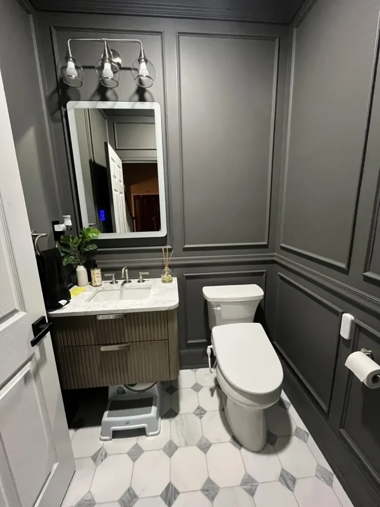 The molding panels r/HotSwordfish5884 installed create shadows and depth that make the gray walls feel more dynamic. A modern ribbed vanity in a lighter gray tone provides textural contrast while the white marble countertop brightens things up. The geometric tile floor in white with gray diamond accents adds pattern at ground level without competing with the walls.