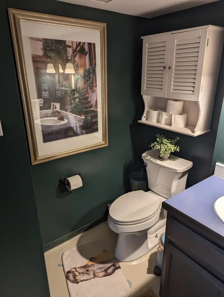 The oversized gold-framed mirror r/Nataliza hung transforms what could be a simple bathroom into something more refined. White louvered cabinet doors on the wall storage add a cottage element that softens the drama of the dark walls. That small faux greenery arrangement on top of the toilet tank brings life to the space without requiring maintenance.