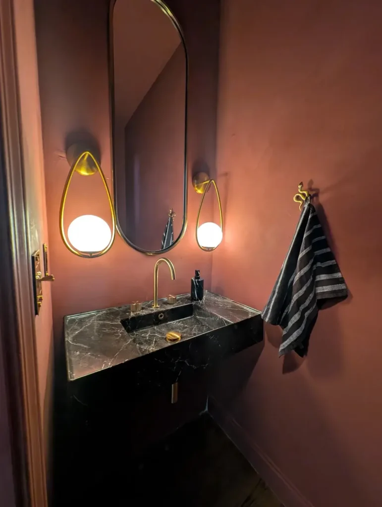 Moody doesn’t require dark colors—it requires bold choices. This terracotta pink creates an unexpected, sophisticated mood that’s completely different from the black powder rooms but equally dramatic.