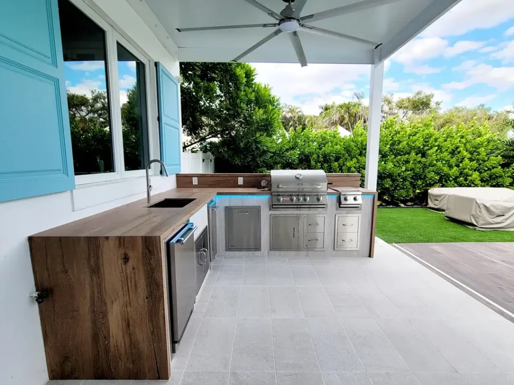 Those blue board-and-batten shutters on the house windows set the entire personality before you even glance at the cooking setup. The whole space radiates “coastal Florida” in the most effortless way relaxed but clearly thought through.