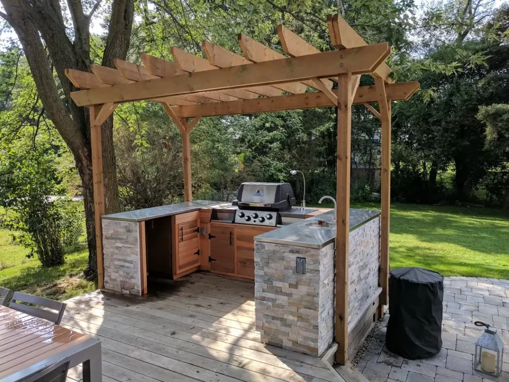 r/assstastic (yes, that’s the username, moving on) shows exactly how to pull this off. Natural cedar cabinet doors in a warm honey tone match the cedar pergola posts and beams almost perfectly. Stacked stone veneer columns on each end of the counter add visual weight and keep all that lighter wood from feeling flimsy.