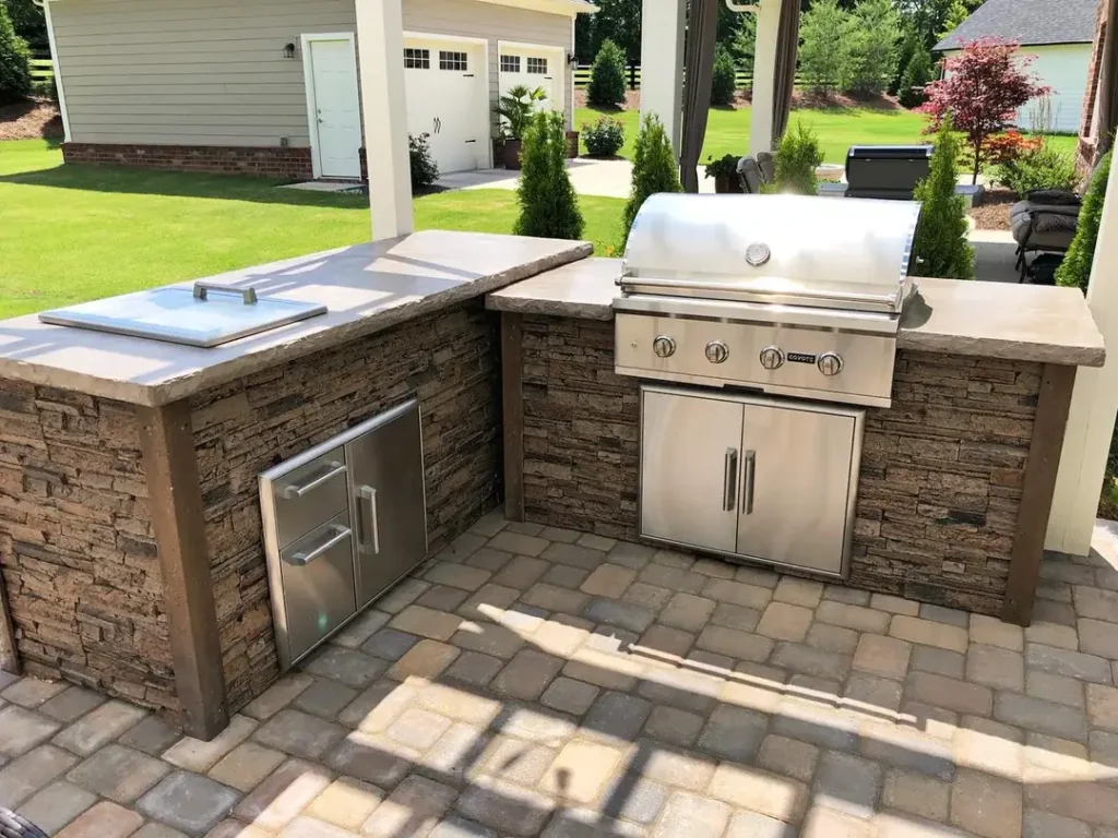 Outdoor kitchens built on paver patios carry a sense of permanence that deck-mounted setups can’t quite replicate. Stone underfoot plus stone on the counters creates a weight and solidity that just suits certain homes perfectly.