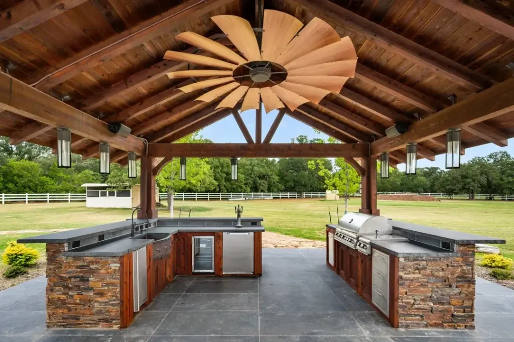 8. Grand Timber Frame Pavilion with Dual Islands and a Statement Windmill Ceiling Fan