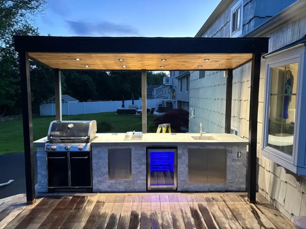 7. Black-Framed Pergola Kitchen with Cedar Ceiling, Blue-Lit Beverage Fridge, and Stone Veneer