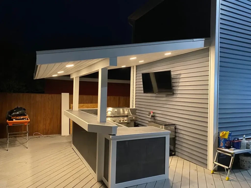 6. Modern Outdoor Bar Kitchen with Recessed Lighting and a Wall-Mounted TV