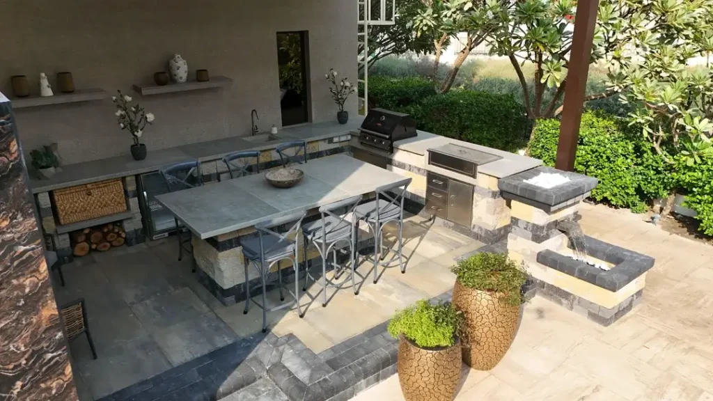 Yes, there’s a wall-mounted flat-screen above the cooking station. I know some people think outdoor TVs are excessive. IMO, if your outdoor kitchen doubles as football-season headquarters, the TV absolutely earns its place. Just make sure it’s rated for outdoor use or at least fully protected under solid cover which this setup provides.