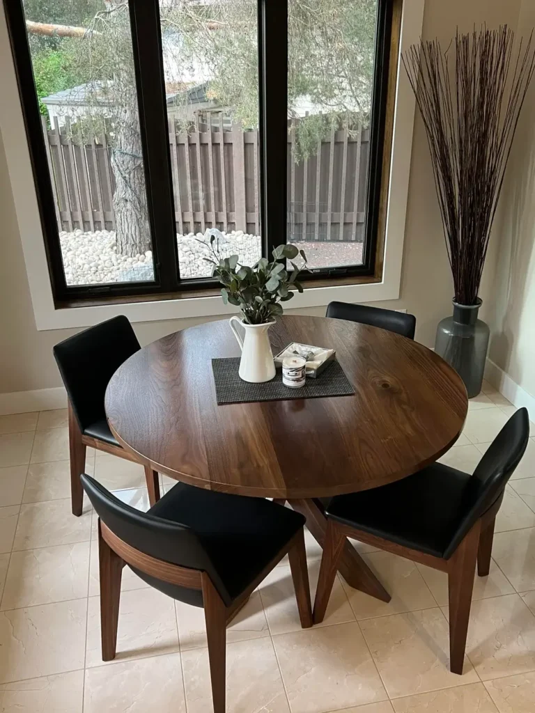 r/awoloshyn placed a solid walnut round table rich, chocolate-brown grain with excellent figure directly in front of a three-panel black-framed window overlooking a garden.