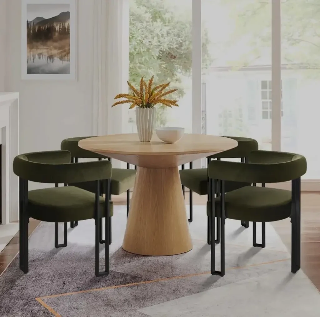 r/GTechGeorge shows a light oak round table on a smooth cylindrical pedestal base a softer, more contemporary silhouette than the traditional turned pedestal paired with four barrel-shaped dining chairs in deep olive green velvet.