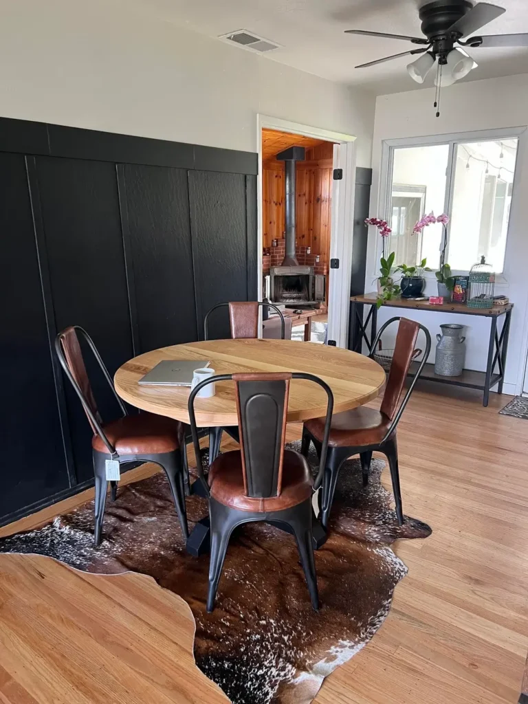 The Industrial Round Table with a Cowhide Rug and Black Board-and-Batten Wall