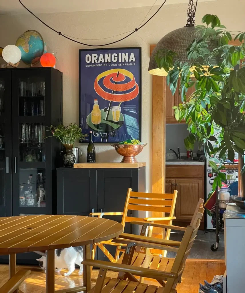 The Orangina poster ties the orange-toned wood to the wall art. The dome pendant echoes the round table shape. Even the cat wandering through the shot seems completely at home.