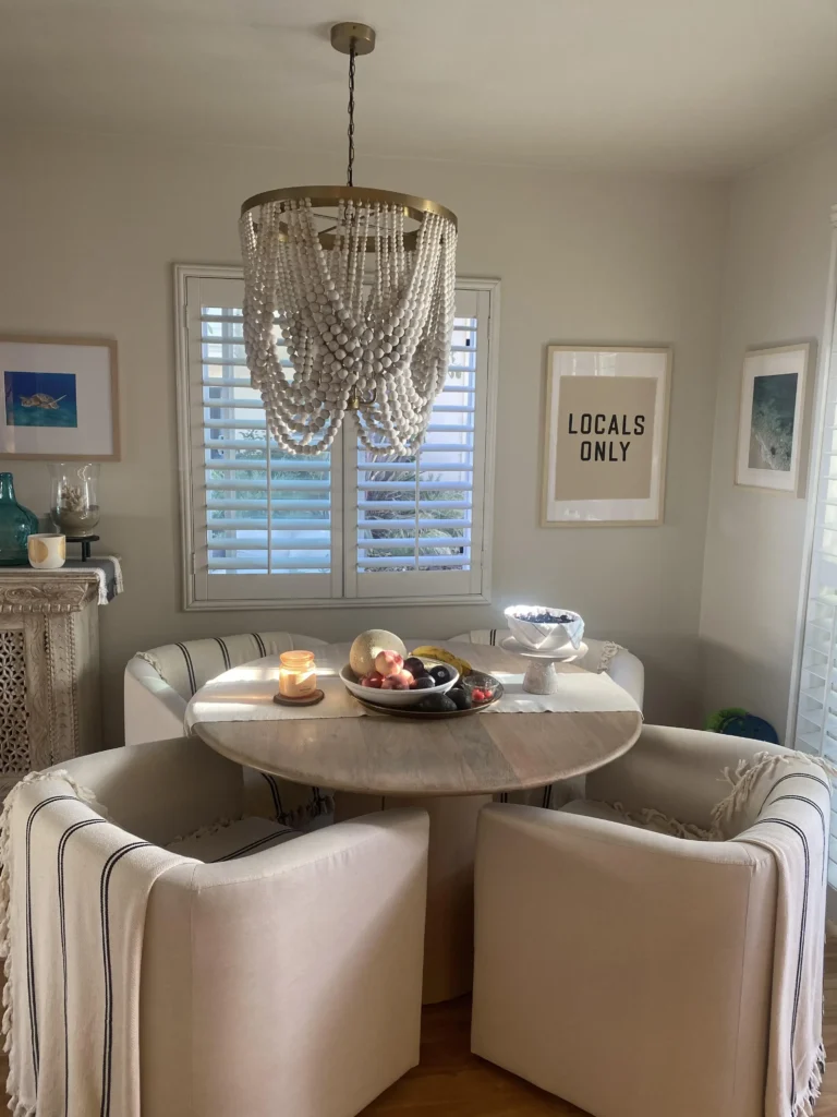 The Coastal Round Table Nook with a Wood Bead Chandelier and Slipcovered Chairs