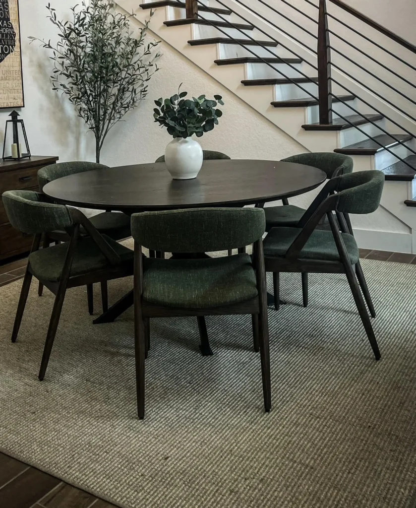 Six chairs around a round table is also worth noting it’s a seating count most people assume requires an oval table, but a 60-inch round can absolutely accommodate six if the chairs aren’t oversized.