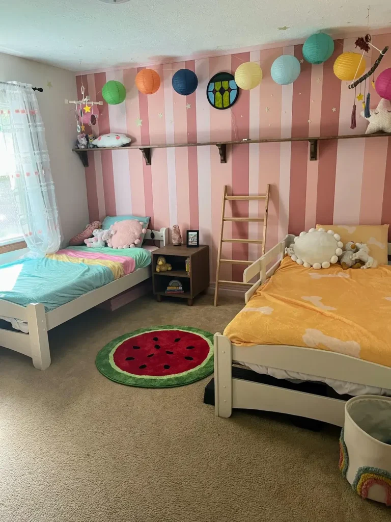 r/saltymapletree painted alternating pink and blush stripes across the main wall, immediately establishing the room’s personality. Two low platform beds sit below, one dressed in rainbow bedding and the other in sunny yellow. The paper lanterns strung across the ceiling add whimsy and color without permanent installation. That watermelon-shaped rug on the floor is playful and practical.