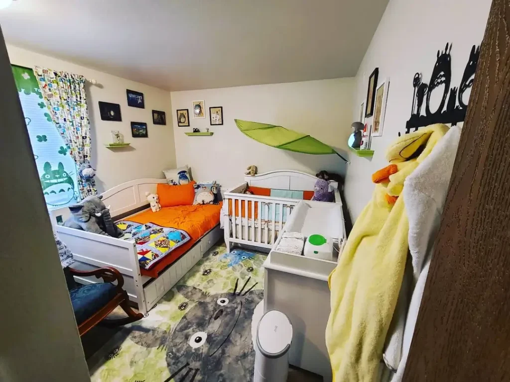 What works here is the clear division of function. The baby’s needs are concentrated in one corner with the crib, dresser, and changing area. The older child’s bed sits separately with its own space. The neutral walls and strategic furniture placement keep the room from feeling crowded despite serving two very different purposes.