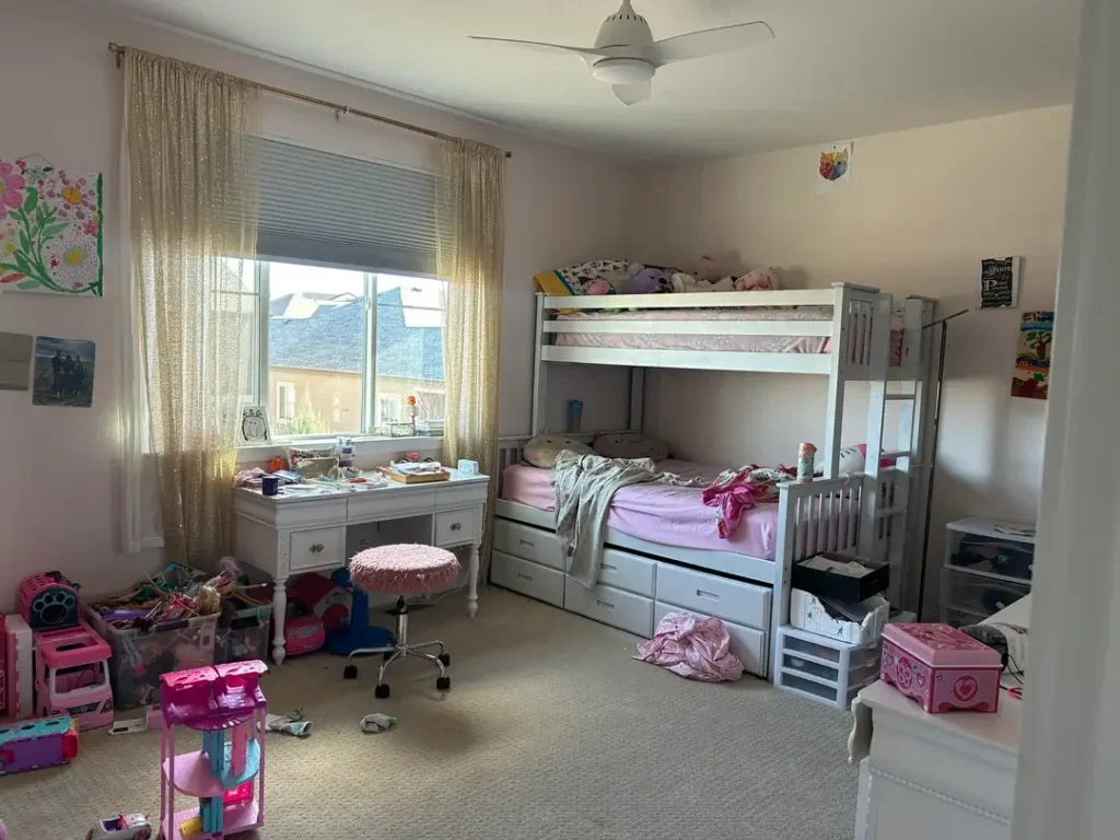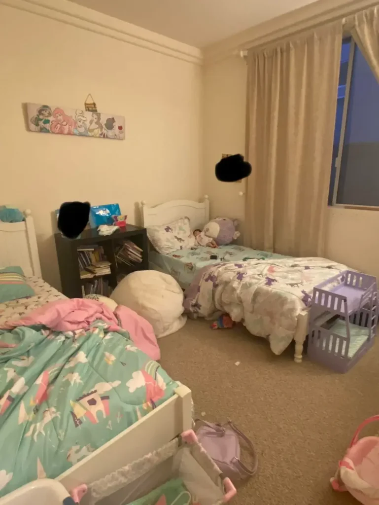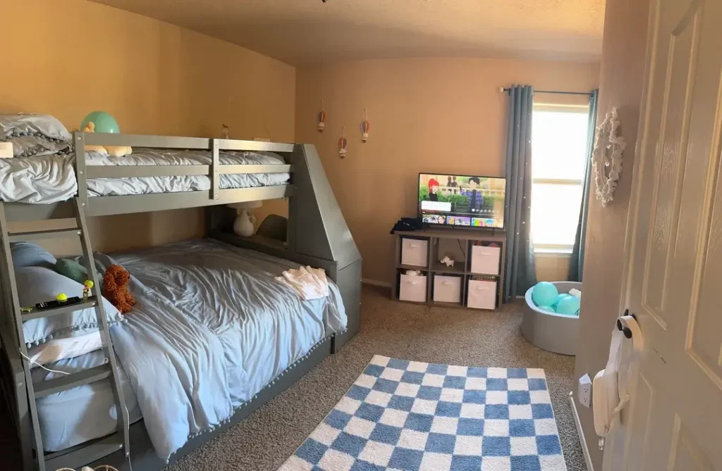 This is reality, not aspiration. The room shows clear signs of daily use, and that’s exactly what a shared bedroom should accommodate.
