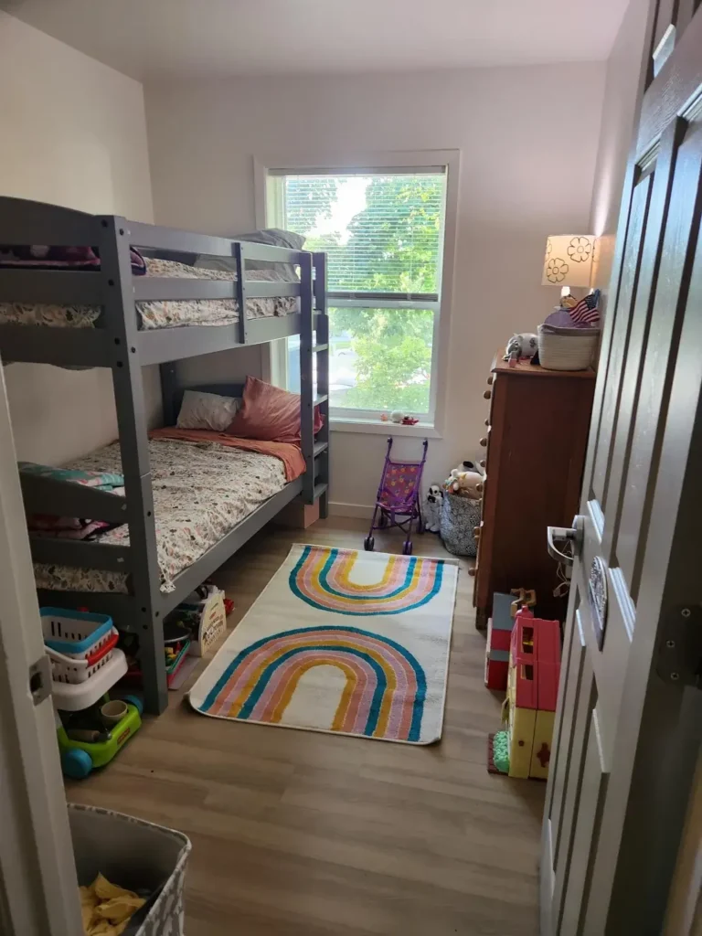 Notice the minimal decor. A couple of toys, a baby doll stroller, but nothing excessive. This is intentional. In a shared room with limited square footage, less clutter means more breathing room. The wood flooring throughout helps the space feel cohesive.