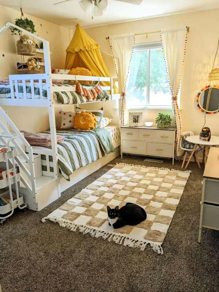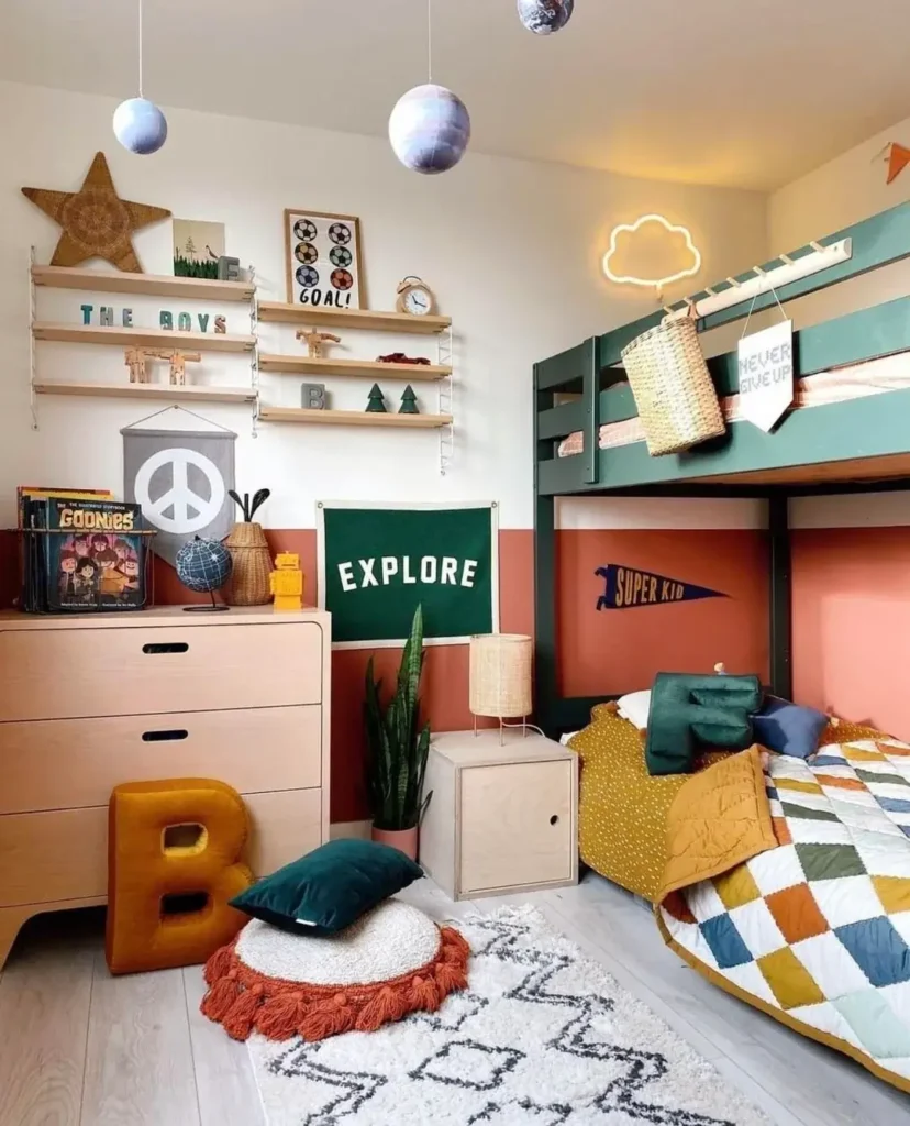 You can go bold or stay neutral, but intentionality matters. Coordinated colors create visual calm. Distinct colors for each child’s area can help define zones. Neutral walls with colorful accents offer flexibility as tastes change. Whatever you choose, having a plan prevents the room from looking chaotic.