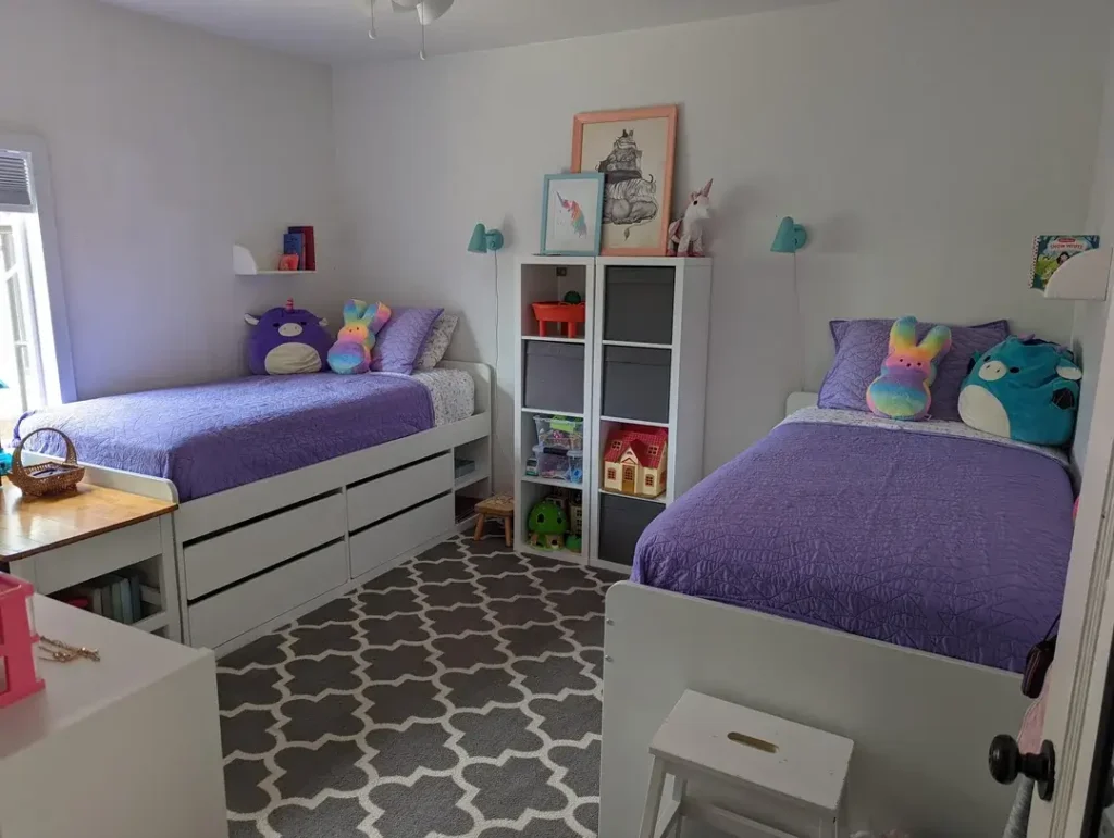 The two beds in this room mirror each other with matching purple quilts and gray patterned sheets. r/SecuretheSalt positioned them against opposite walls with a tall cube storage unit centered between them. This creates a natural divider while providing shared storage that’s equally accessible. The white furniture keeps the room bright, and those turquoise wall hooks add pops of color without overwhelming the calm palette.