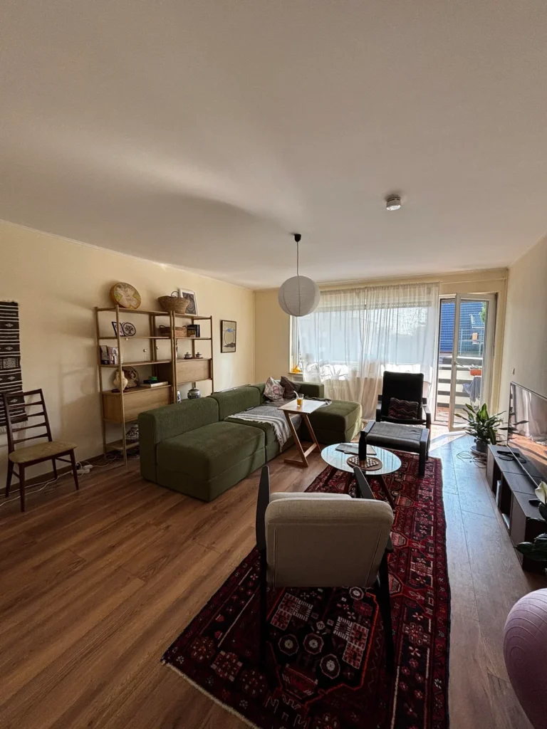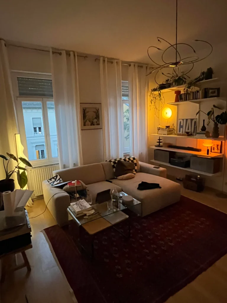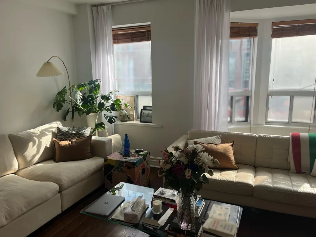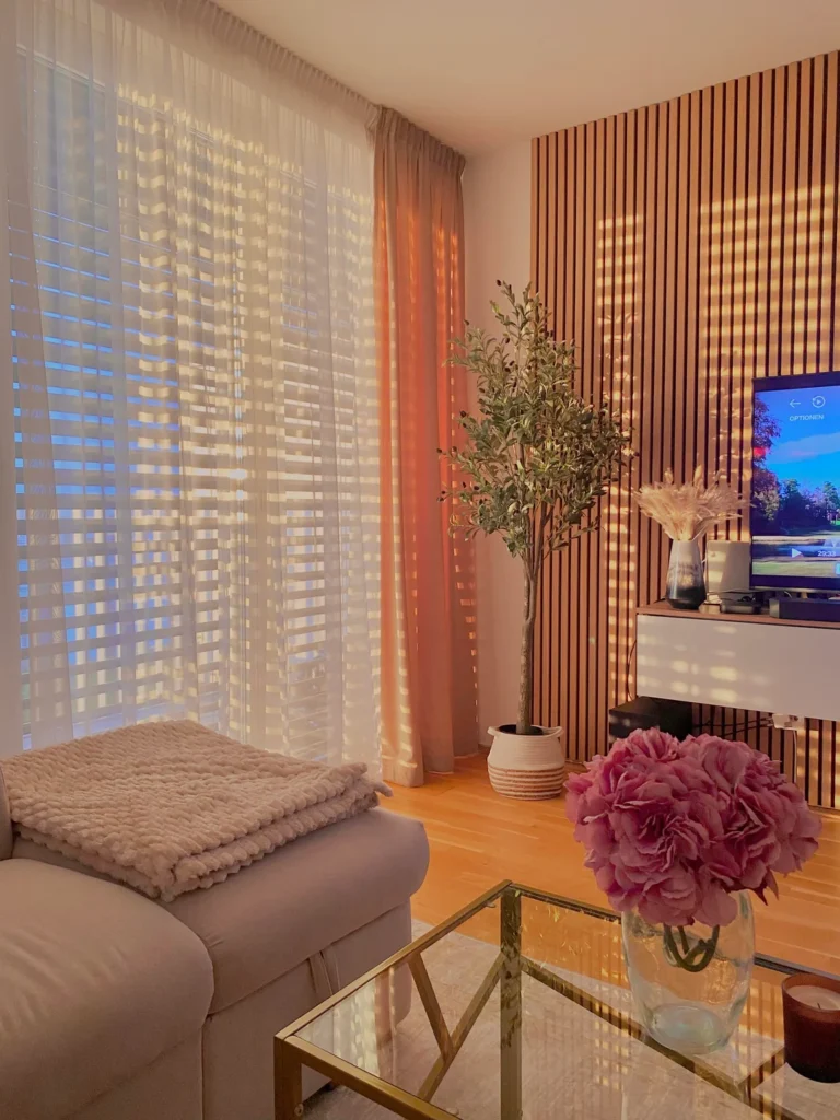 During the day, the sheer filters light. At golden hour, it transforms it. The wooden slat wall glows. Pink peonies on the coffee table practically vibrate. The entire room turns amber-warm in a way that no lamp or smart bulb can replicate. I’ve tried. It’s not the same.