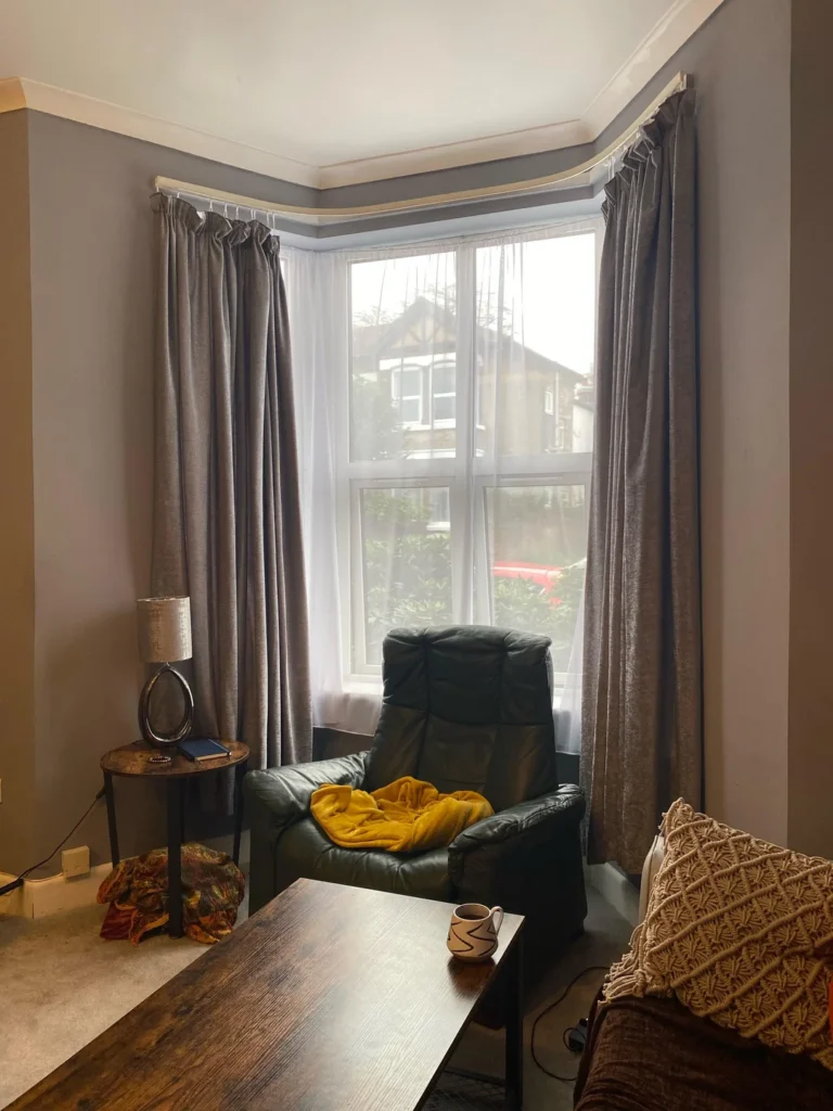 r/NeatFaithlessness400 took the smarter route. They installed a curved bay window rod that follows the architecture, so both the sheer underlayer and the heavy taupe-grey velvet curtains flow around the bend without interruption. The sheers glow softly in the center behind a leather reading chair (great use of the space, BTW), and the velvet panels frame the whole scene from both sides.