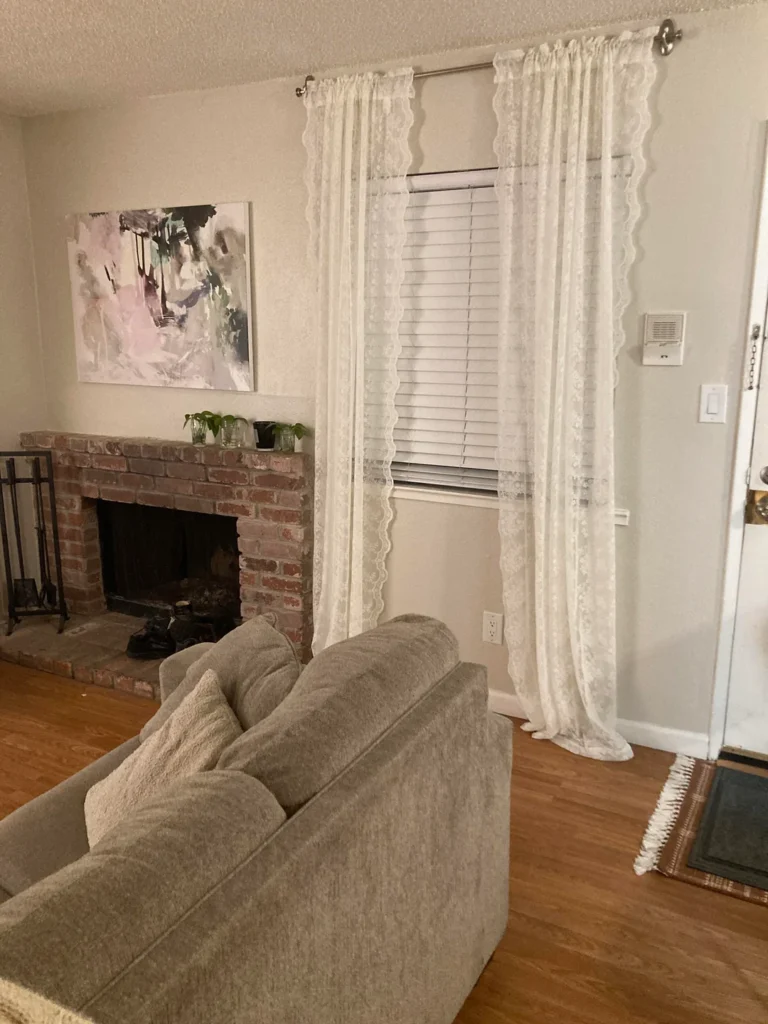 r/porcelainlady has a room with seriously strong bones. A brick fireplace with a worn firebox, textured plaster ceiling, honey oak hardwood floors. They paired all of that with white lace-edged sheer curtains on a simple chrome rod. The curtains pool softly on the floor, and the lace border along the vertical edges adds a delicacy that plain voile just can’t deliver. An abstract expressionist canvas in pink, lavender, and charcoal above the fireplace provides one hit of contemporary contrast.
