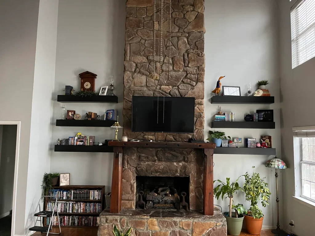 Some rooms have a feature so strong that everything else needs to work around it — and a floor-to-ceiling stone fireplace is exactly that. r/imthefkinglizardking didn’t try to compete with it. Instead, they leaned in, mounting dark floating shelves on either side to frame the whole wall.