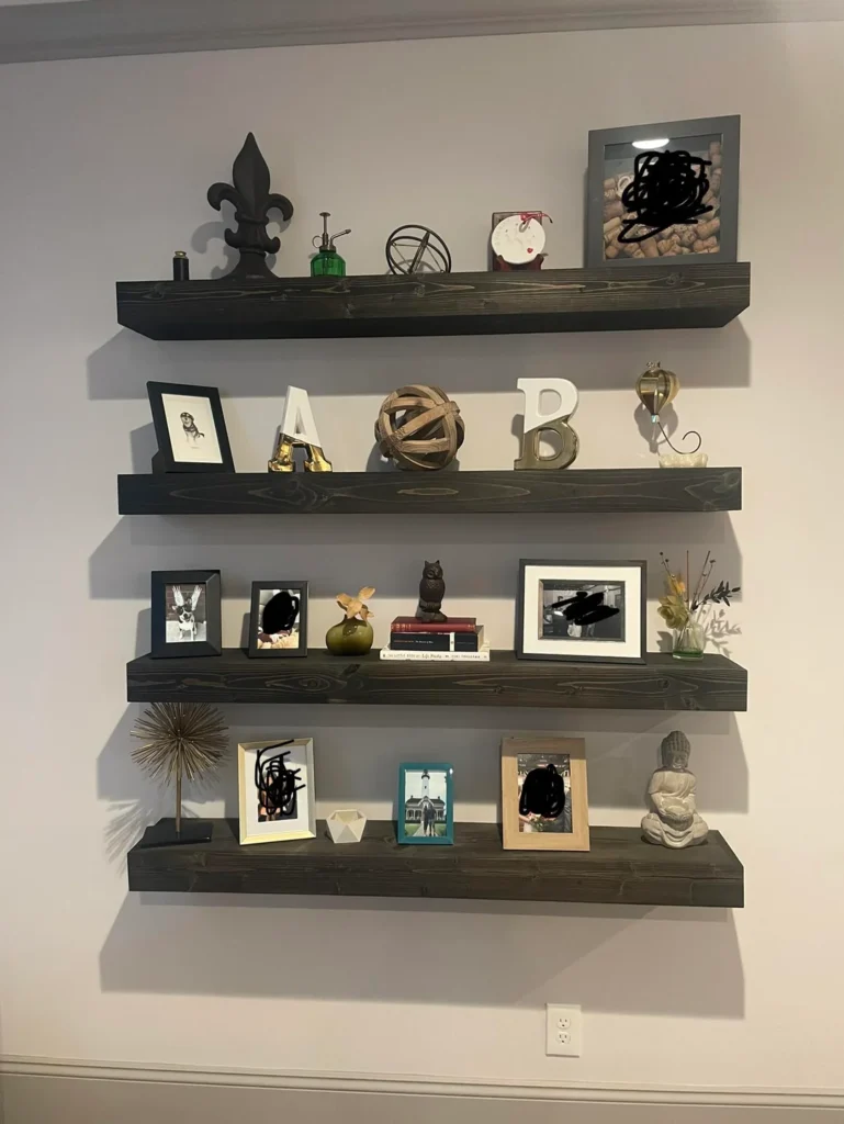 Here’s a shelf setup that’s unapologetically personal — and all the better for it. r/BaileyIsaGirlsName turned four dark floating shelves into something between a gallery wall and a memory board. Framed pet portraits, family photos, decorative letters, ornamental spheres, small sculptures — it’s a lot, but it works because there’s a consistent color story running through it all.