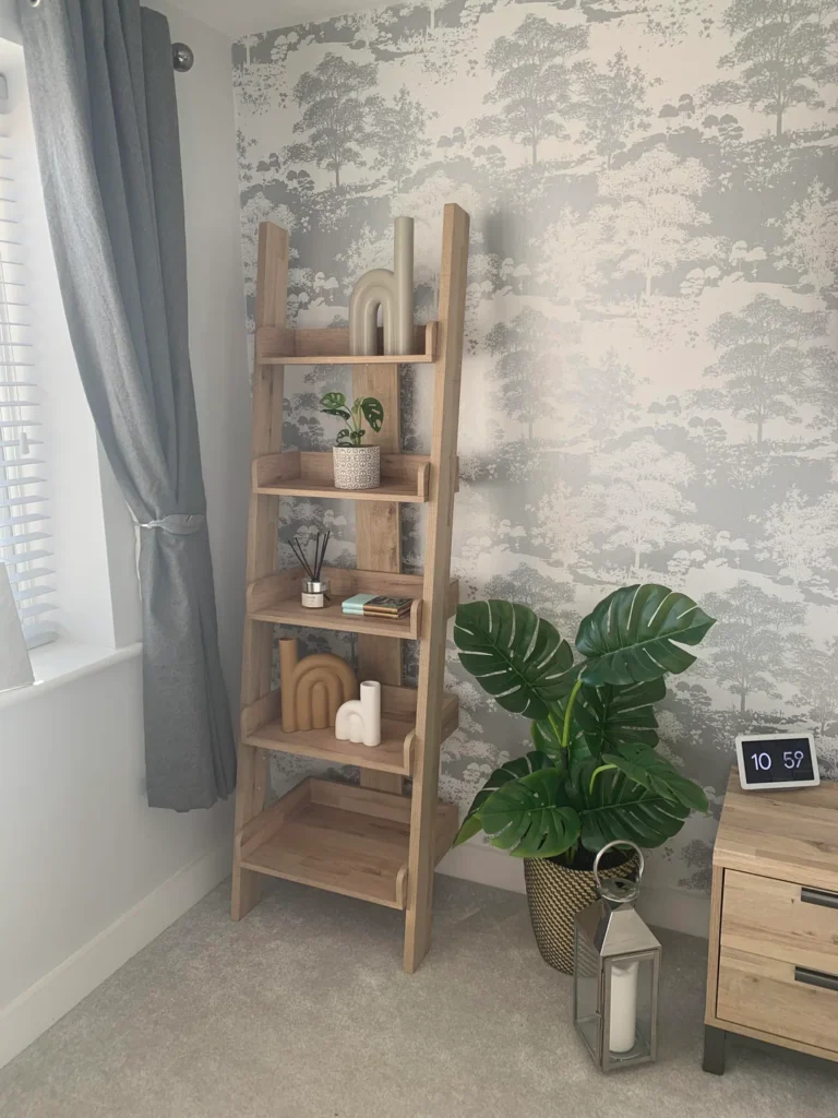 Not every living room has a full wall to dedicate to shelving, and that’s where the ladder shelf quietly earns its place. r/DesignMyRoom styled this oak-toned leaning shelf beautifully — and the wallpaper behind it deserves its own mention. That soft grey forest print gives the whole corner a dreamy, layered quality that makes a simple shelf feel like a considered design moment.